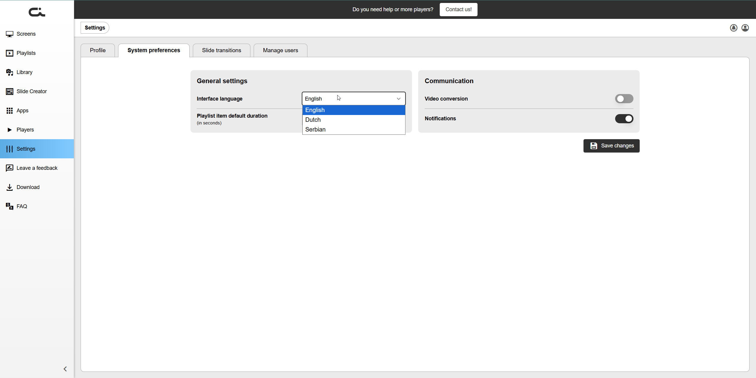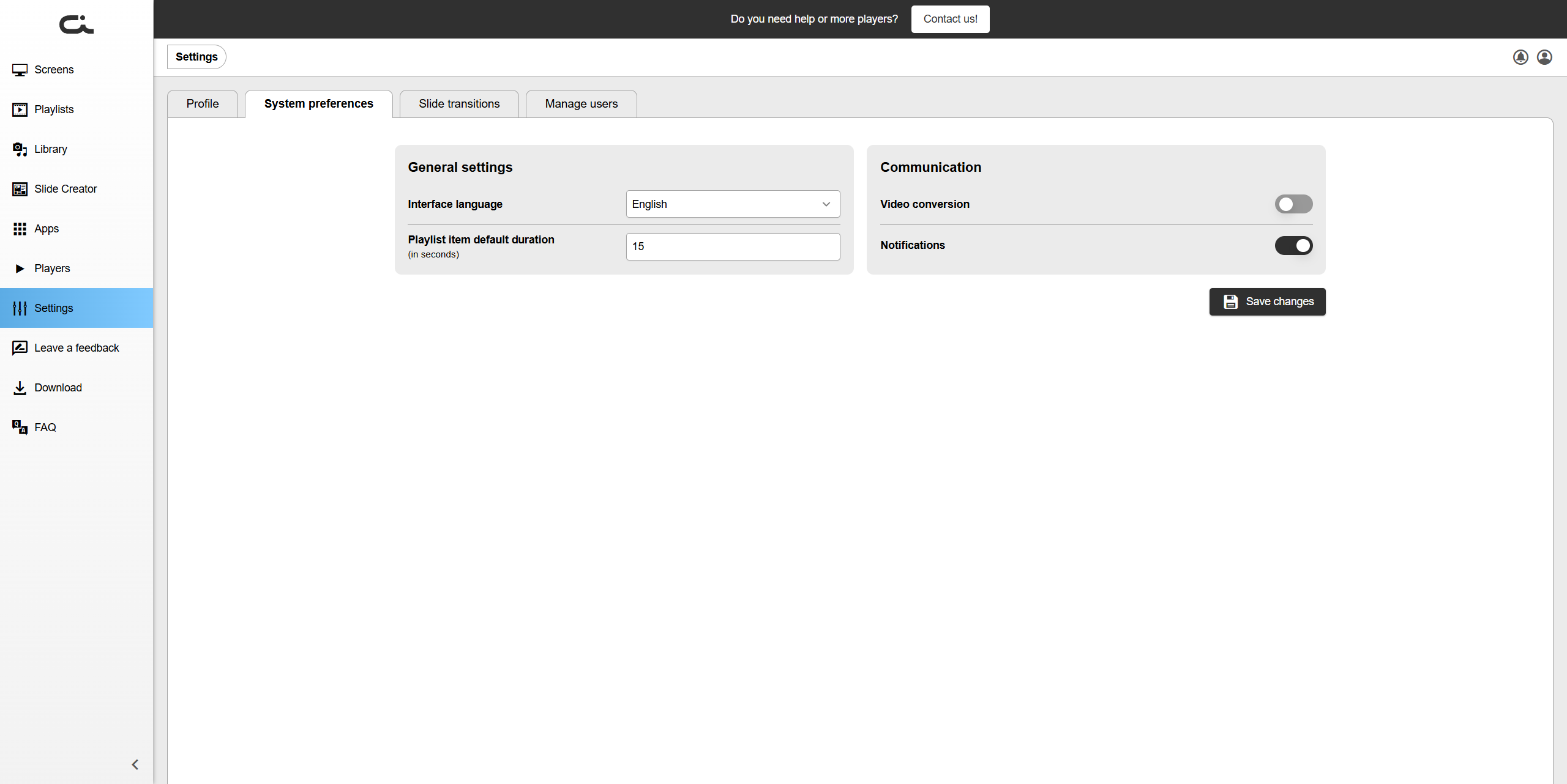 Stel de standaardduur (in seconden) in voor items die je toevoegt aan afspeellijsten. Dit is de tijd dat elk item wordt weergegeven voordat het volgende start. De standaardwaarde is 15 seconden, maar je kunt dit aanpassen aan je content.