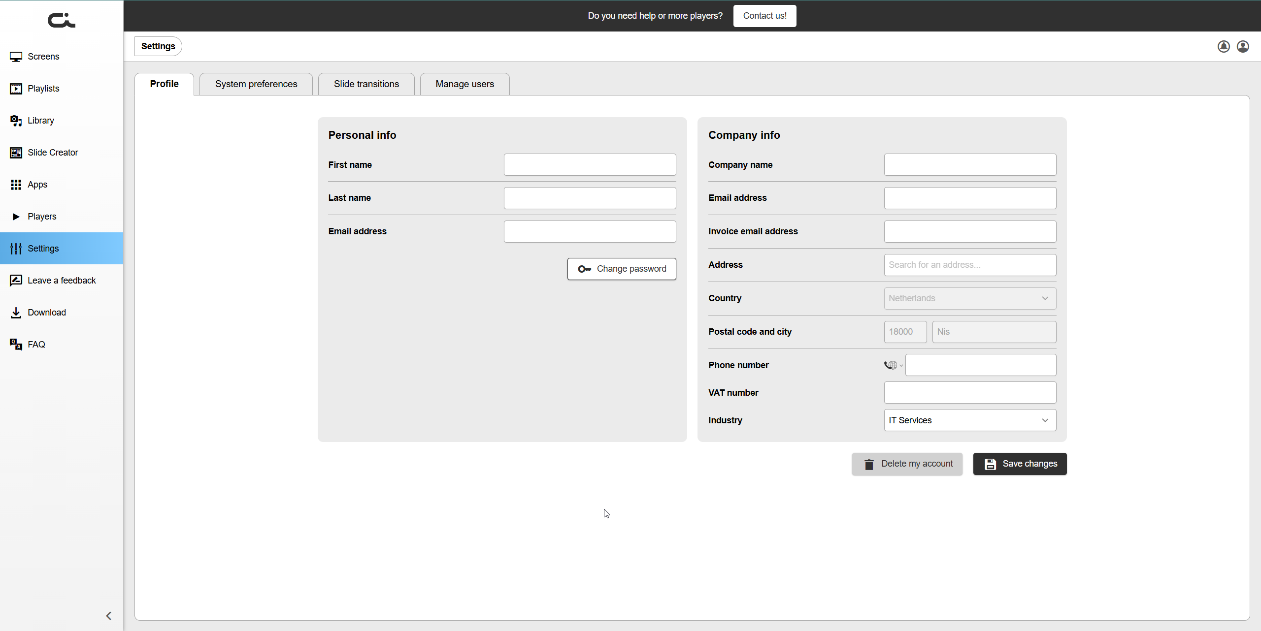 De sectie Instellingen is je controlecentrum om Castit af te stemmen op de behoeften van je organisatie. Hier beheer je je profiel, pas je systeemvoorkeuren aan, personaliseer je dia-overgangen en beheer je gebruikerstoegang.